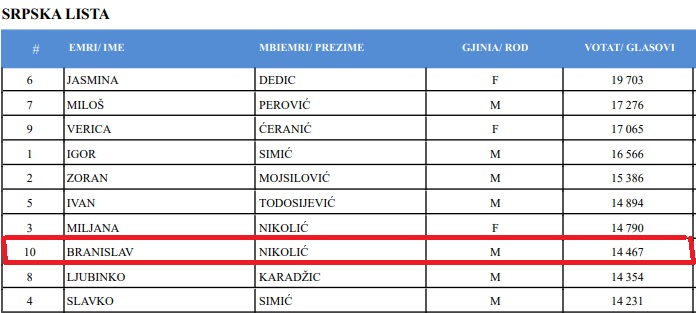 Branislav Nikolic ka arritur të marrë 14 mijë e 467 vota në kuadër të Listës Serbe duke arritur të bëhet deputet në legjislaturën e re.