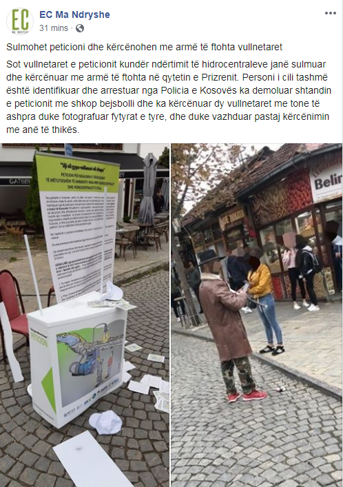 Sot, thuhet në njoftim, vullnetarët e peticionit kundër ndërtimit të hidrocentraleve janë sulmuar dhe kërcënuar me armë të ftohta në qytetin e Prizrenit.