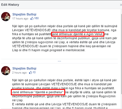 “Një lajm që po qarkullon nëpër disa portale që kanë për qëllim të sulmojnë Lëvizjen VETËVENDOSJE! dhe mua si kandidat për kryetar komune, nga frika e humbjes së pushtetit janë shfrenuar djemtë e Agim Veliut, me shpifje të ulta që kanë qëllim të dezinformojnë publikun, gjoja unë kam për qëllim të ç’rrënjos rugovizmin në Llap”, ka shkruar Bulliqi mbrëmë.