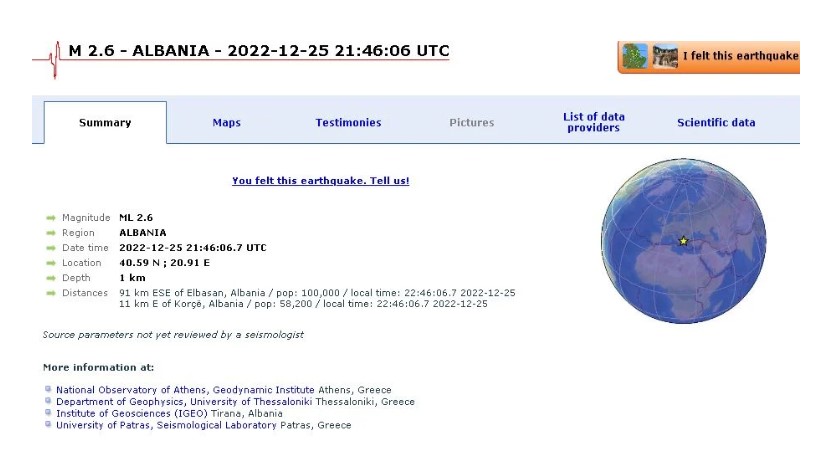 Sipas të dhënave bëhet me dije se epiqendra e tërmetit ishte 11 kilometra larg nga Korça ndërsa magnituda ishte 2.6.