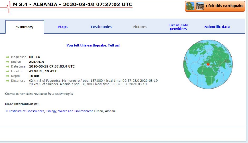 Mësohet se tërmeti është regjistruar 20 km larg Shkodrës dhe magnitude ka qenë 3.4