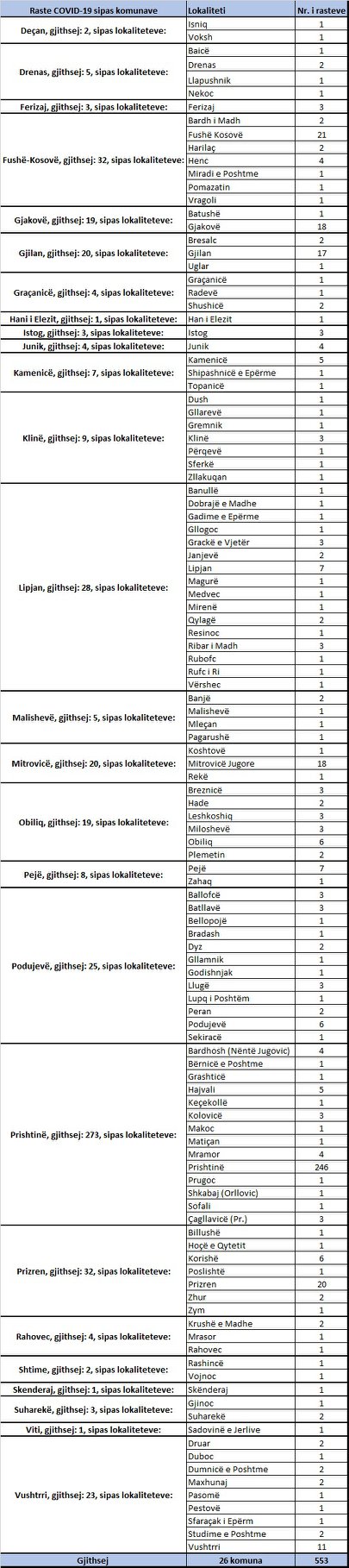 Rastet pozitive janë nga komunat: Prishtinë 273 raste, Fushë-Kosovë 32 raste, Prizren 32 raste, Lipjan 28 raste, Podujevë 25 raste, Vushtrri 23 raste, Gjilan 20 raste, Mitrovicë 20 raste, Gjakovë 19 raste, Obiliq 19 raste, Klinë 9 raste, Pejë 8 raste, Kamenicë 7 raste, Drenas 5 raste, Malishevë 5 raste, Graçanicë 4 raste, Junik 4 raste, Rahovec 4 raste, Ferizaj 3 raste, Istog 3 raste, Suharekë 3 raste, Deçan 2 raste, Shtime 2 raste dhe me nga një rast komunat Hani i Elezit, Skenderaj dhe Viti 1.