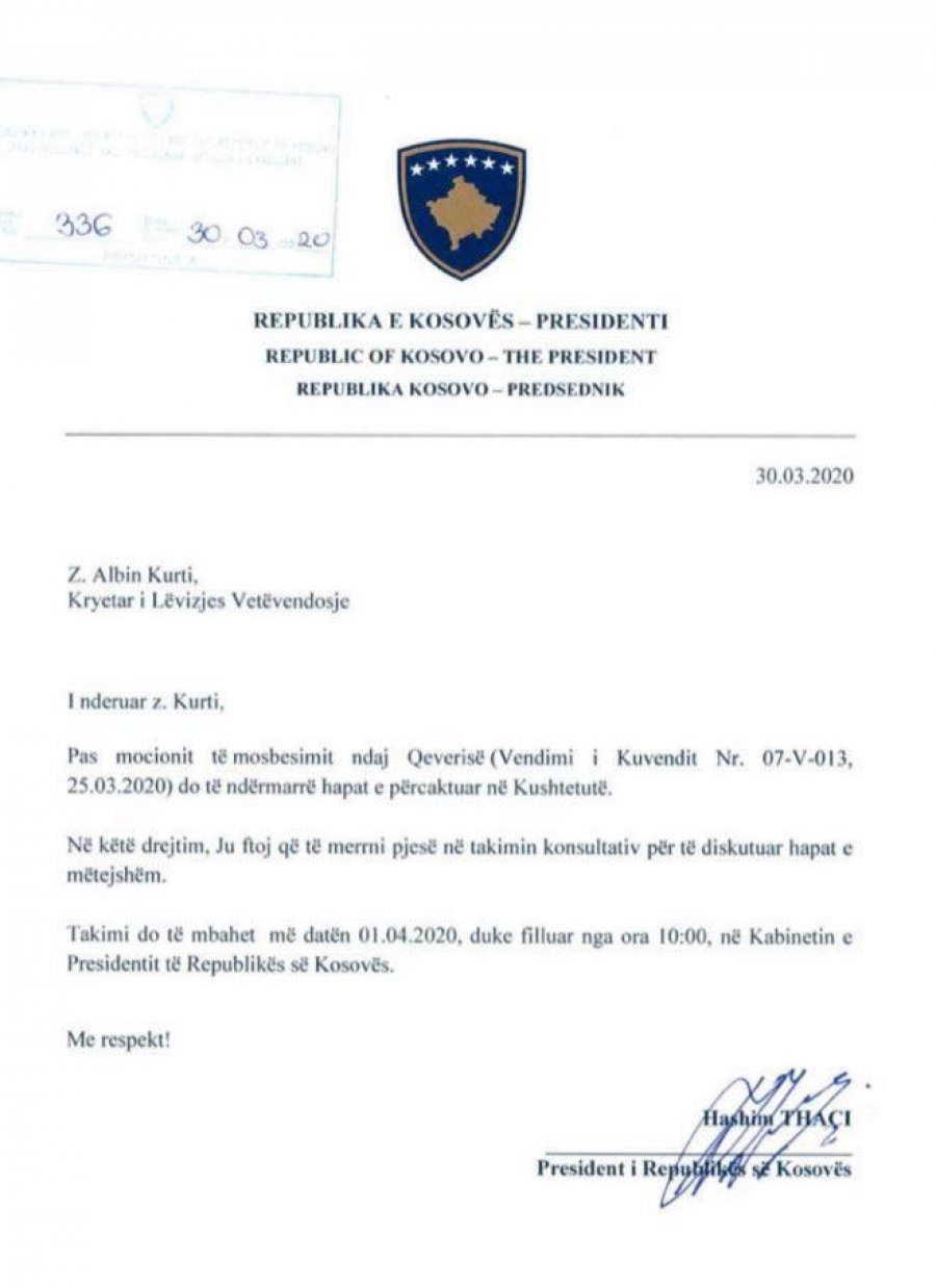 “Pas mocionit të mosbesimit ndaj Qeverisë, do të ndërmarr hapat e përcaktuar në Kushtetutë. Në këtë drejtim, Ju ftoj që të merrni pjesë në takimin konsultativ për të diskutuar hapat e mëtejshëm. Takimi do të mbahet më datë 1.04.2020, duke filluar nga ora 10:00, në Kabinetin e Presidentit të Republikës së Kosovës”, shkruan në ftesën e Thaçit drejtuar Kurtit.