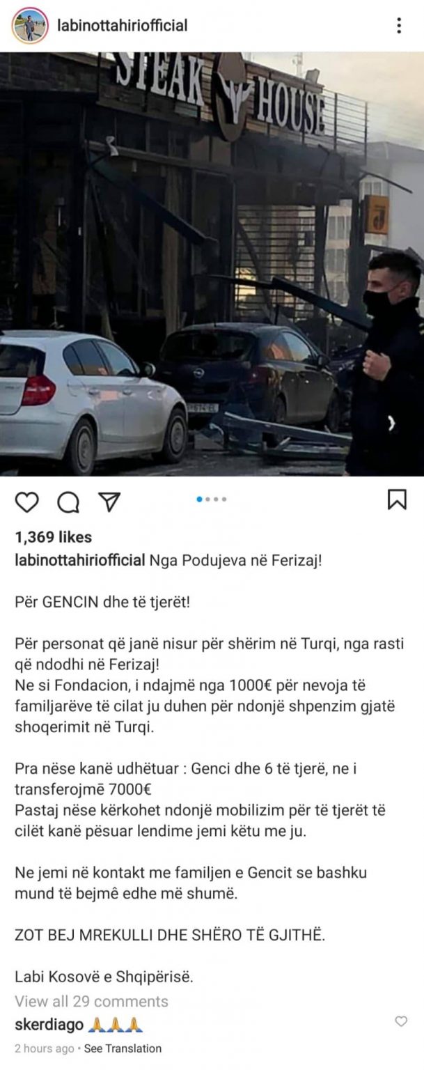 “Nga Podujeva në Ferizaj! Për GENCIN dhe të tjerët! Për personat që janë nisur për shërim në Turqi, nga rasti që ndodhi në Ferizaj! Ne si Fondacion, i ndajmë nga 1000€ për nevoja të familjarëve të cilat ju duhen për ndonjë shpenzim gjatë shoqerimit në Turqi. Pra nëse kanë udhëtuar : Genci dhe 6 të tjerë, ne i transferojmē 7000€ Pastaj nëse kërkohet ndonjë mobilizim për të tjerët të cilët kanë pësuar lendime jemi këtu me ju. Ne jemi në kontakt me familjen e Gencit se bashku mund të bejmê edhe më shumë. ZOT BEJ MREKULLI DHE SHËRO TË GJITHË. Labi Kosovë e Shqipërisë”.