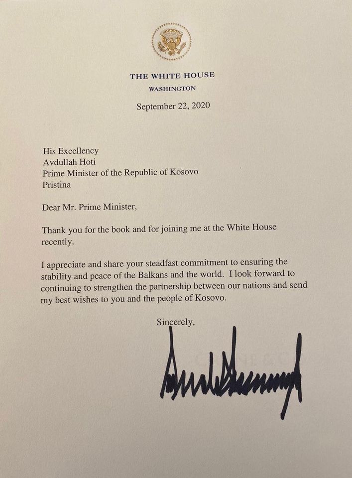 Në të, Trump e falënderon Hotin për vizitën në Shtëpinë e Bardhë ku u nënshkrua marrëveshja e 4 shtatorit për normalizim ekonomik me Serbinë.