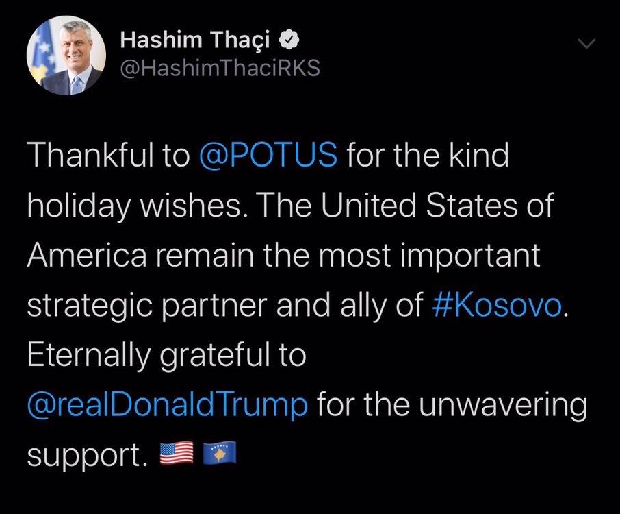 Presidenti Thaçi e ka falënderuar presidentin Trump për urimin, duke ritheksuar se Shtetet e Bashkuara të Amerikës janë aleati më i rëndësishëm strategjik i Kosovës.