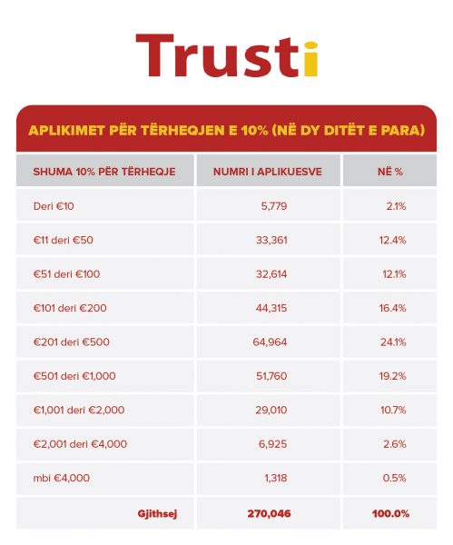 Sipas FKPK-së, 5 mijë e 779 persona do të marrin nga kursimet deri në 10 euro. 33 mijë e 361 aplikues do të marrin nga 11 deri në 50 euro nga Trusti. 32 mijë e 614 persona do të tërheqin nga 51 deri në 100 euro. 44 mijë e 315 persona do të marrin nga 101 deri në 200 euro. 63 mijë e 964 persona do të marrin nga 201 deri në 500 euro. 51 mijë e 760 persona do të marrin nga 501 deri në 1 mijë euro. 29 mijë e 10 persona do të marrin nga 1 mijë e 1 deri në 2 mijë euro. 6 mijë e 925 persona do të marrin nga 2 mijë e 1 deri në 4 mijë euro. Ndërsa 1 mijë e 318 persona do të marrin mbi 4 mijë euro nga kursimet e tyre në Trust.