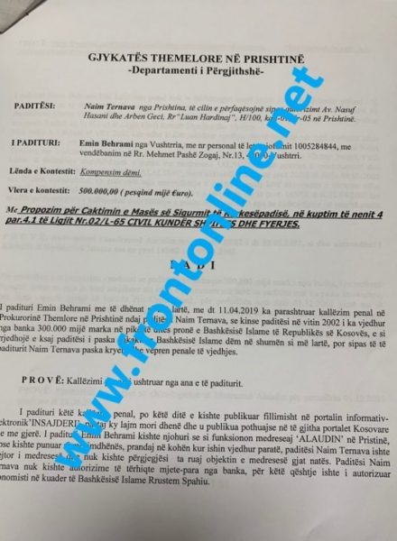 Gjykata Themelore e Prishtinës ka caktuar për nesër (e enjte) seancën, ku palë paditëse është kryeimami i Kosovës, Naim Tërnava, ndërsa i padituri Emin Behrami, i cili më 11 prill 2019 kishte ushtruar kallëzim penal ndaj shefit të Bashkësisë Islame të Kosovës (BIK) me pretendimet se në vitin 2002 i ka vjedhur 300 mijë marka gjermane, siç kishte thënë ai, në pikë të ditës pronë të BIK-ut.