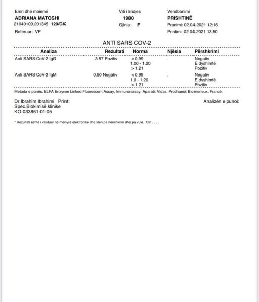Pas kësaj ka reaguar vetë Matoshi e cila e ka publikuar rezultatin e testit në profilin e saj në Facebook.