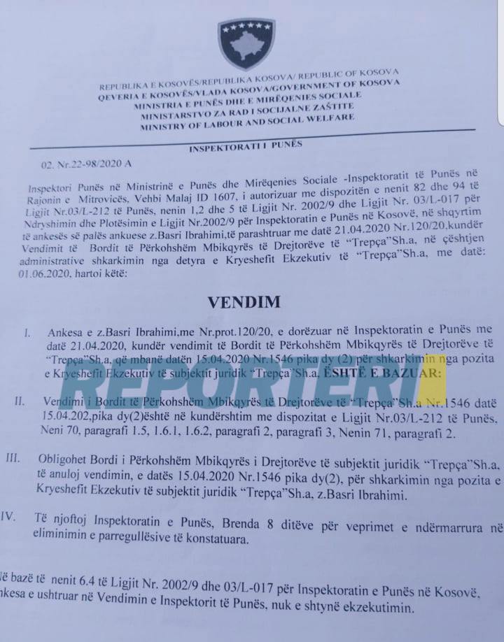 Inspektorati i Punës e ka kthyer në detyrë edhe një Kryeshef të shkarkuar në kohën e Qeverisësë Albin Kurtit. Basri Ibrahimi ishte Kryeshef Ekzekutiv i Trepçës por u shkarkua nga Bordi i ri i saj, i emëruar nga Qeveria e Albin Kurtit.