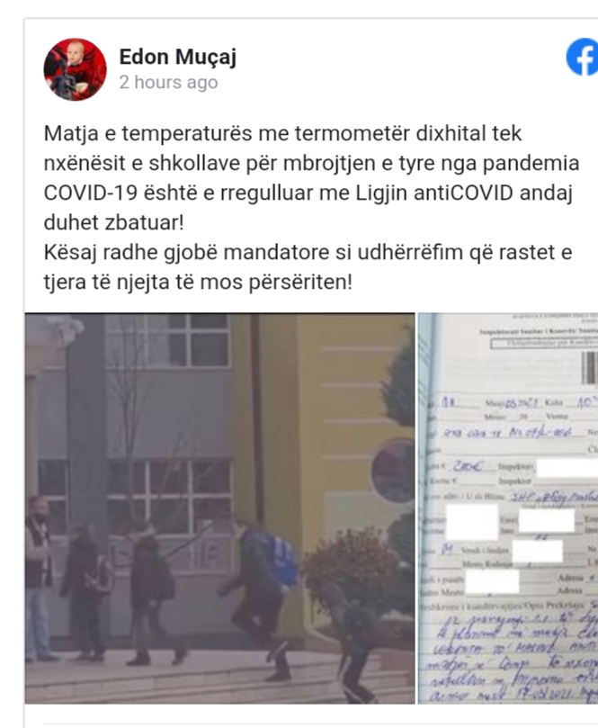 “Matja e temperaturës me termometër digjital tek nxënësit e shkollave për mbrojtjen e tyre nga pandemia COVID-19 është e rregulluar me Ligjin antiCOVID andaj duhet zbatuar. Kësaj radhe gjobë mandatore si udhërrëfim që rastet e tjera të njejta të mos përsëriten!”, shkroi Muçaj në Facebook.