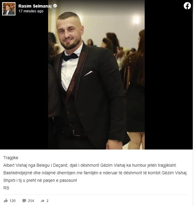 “Tragjike! Alber Vishaj nga Belegu i Deçanit, djali i dëshmorit Gëzim Vishaj ka humbur jetën tragjikisht. Bashkëndjejmë dhe ndajmë dhembjen me familjën e nderuar të dëshmorit të kombit Gëzim Vishaj”, ka shkruar Selmanaj.