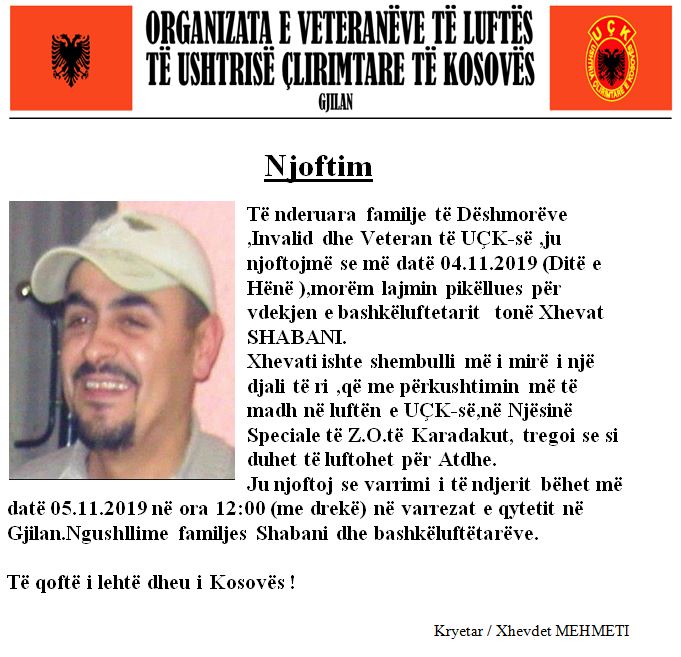 Lajmin për vdekjen e tij e kanë Organizata e Veteranëve të Luftës së UÇK-së dega në Gjilan.
