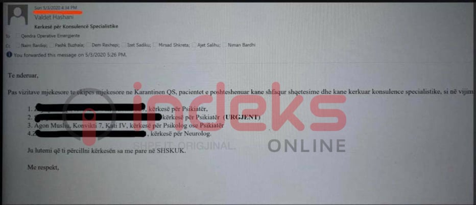 “Të nderuar, pas vizitave mjekësore të ekipit mjekësor në Karantinën QS, pacientët e poshtëshënuar kanë shfaqur shqetësime dhe kanë kërkuar konsulencë specialistike”, thuhet në e-mailin e dërguar nga Hashani.