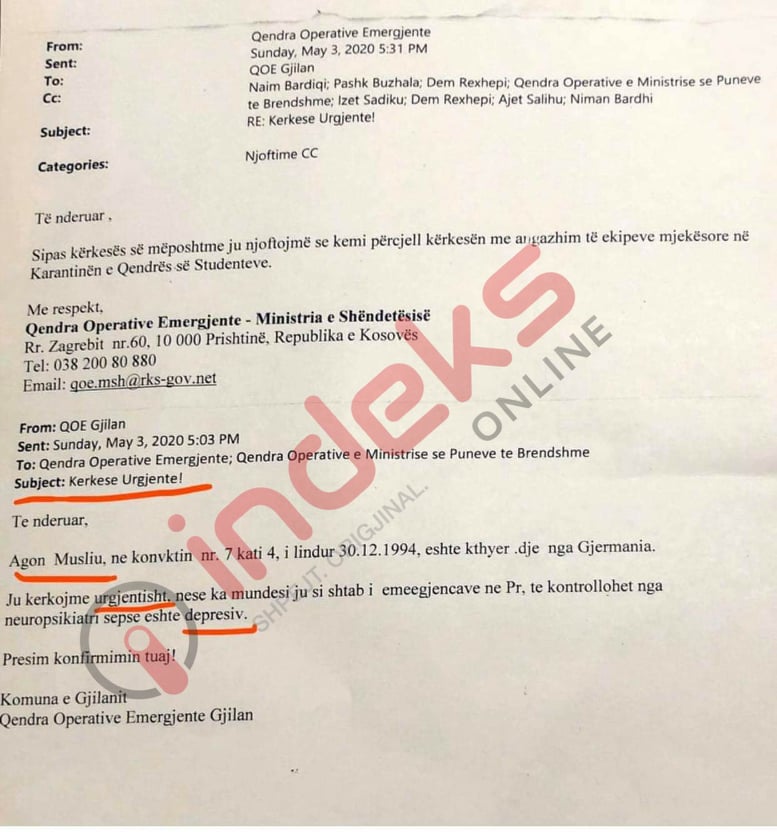 “Të nderuar, Agon Musliu, ne konviktin nr. 7, kati 4, i lindur me 30.12.1994, është kthyer dje nga Gjermania. Ju kërkojmë urgjentisht, nëse keni mundësi ju si shtab i emergjencave në Prishtinë, të kontrollohet nga neuropsikiatri, sepse është depresiv. Presim konfirmimin tuaj”, thuhet në e-mailin e Qendrës Operative Emergjente e Gjilanit.