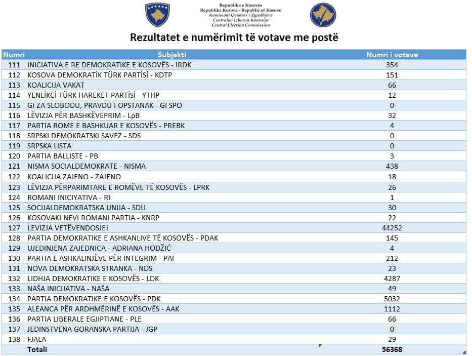 Sipas rezultateve Vetëvendosje ka siguruar 58 ulëse në Kuvendin e Kosovës ose 49.9 për qind.