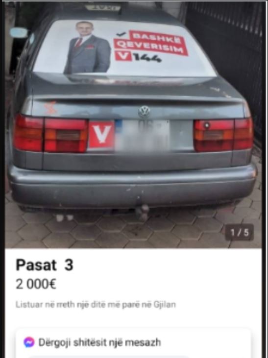 Një veturë e mbuluar me sloganet e Lëvizjes Vetëvendosje të zgjedhjeve të vitit të kaluar “Krejt dhe Drejt” dhe “Bashkë Qeverisim” ka dalë në shitje.