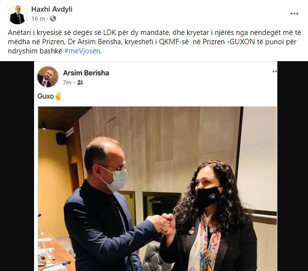 “Anëtari i kryesisë së degës së LDK për dy mandate, dhe kryetar i njërës nga nëndegët më të mëdha në Prizren, Dr Arsim Berisha, kryeshefi i QKMF-së në Prizren -GUXON të punoi për ndryshim bashkë #meVjosën”, ka shkruar Avdyli në Facebook.