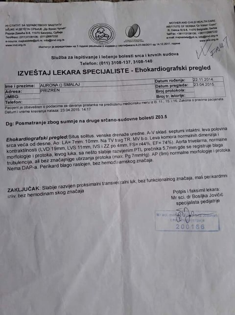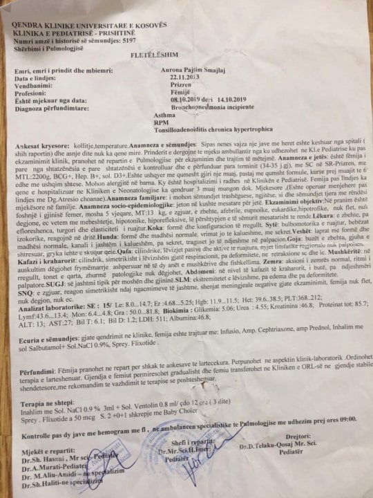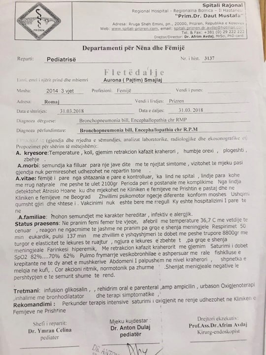 “I kemi rregulluar disa dokumente e kemi dërguar në Beograd, brenda mundësive sa me ja shpëtu jetën, por tash tu u rritë po i përkeqësohet gjendja, sa me fillu me u ushqy pak me shishe. Në Beograd i kanë thanë po e operojmë sa me ja shpëtu jetën, e kemi operu por i duhet edhe një operim tjetër pas 4 viteve. Atje na thanë që gjithëqysh duhet kur t’i bën vajza 5 vite”, thotë ajo.
