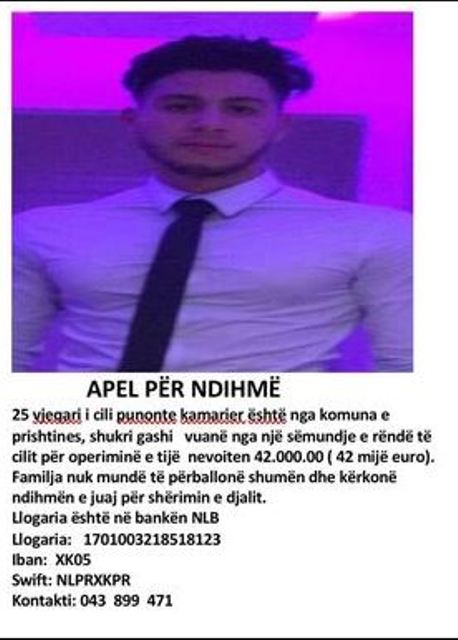 Shukri Gashi, 25-vjeçar nga Prishtina vuan nga një sëmundje e rëndë dhe i duhet ndihma e qytetarëve për të ju nënshtruar një operimi në Turqi.