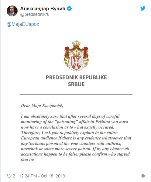 Aleksandar Vuçiq i ka drejtuar një letër zëdhënëses së Bashkimit Evropian, Maja Kocijançiq duke i kërkuar sqarime në lidhje me rastin e helmimit të zyrtarëve kosovarë nga kutitë me vota të ardhura nga Serbia.