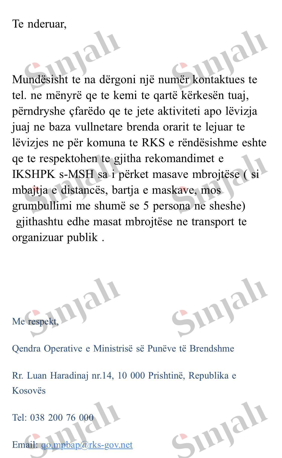 “Të nderuar, mundësisht të na e dërgoni një numër kontaktues të tel. në mënyrë që ta kemi të qartë kërkesën tuaj. Përndryshe çfarëdo që të jetë aktiviteti apo lëvizja juaj në baza vullnetare brenda orarit të lejuar të lëvizjes nëpër komuna të RKS, e rëndësishme është që të respektohen të gjitha rekomandimet e IKSHPK-së dhe MSH-së sa i përket masave mbrojtëse (si mbajtja e distancës, bartja e maskave, mosgrumbullimi i më shumë se 5 personave në sheshe), gjithashtu edhe masat mbrojtëse në transport të organizuar publik”, thuhet në përgjigjen që Qendra Operative e MPB-së ia kishte dërguar reperit me e-mail.