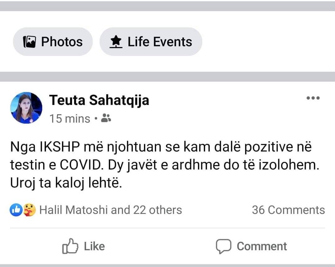 “Nga IKSHP më njohtuan se kam dalë pozitive në testin e COVID. Dy javët e ardhme do të izolohem. Uroj ta kaloj lehtë”, ka shkruar Sahatqija.