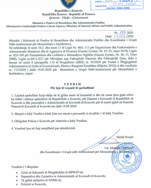 Zëvendësministri në detyrë i Punëve të Brendshme, Xhelal Sveçla, ka nënshkruar të hënën vendimin për leje të veçantë të qarkullimit me të cilin pajis me leje deputetët që do të marrin pjesë nesër në seancën e Kuvendit. Leja e lëshuar nga Sveçla vjen pas masave të reja nga Ministria e Shëndetësisë për kufizim të lëvizjes së qytetarëve që u vlerësua përsëri antikushtetuese nga njohës të sistemit kushtetues.