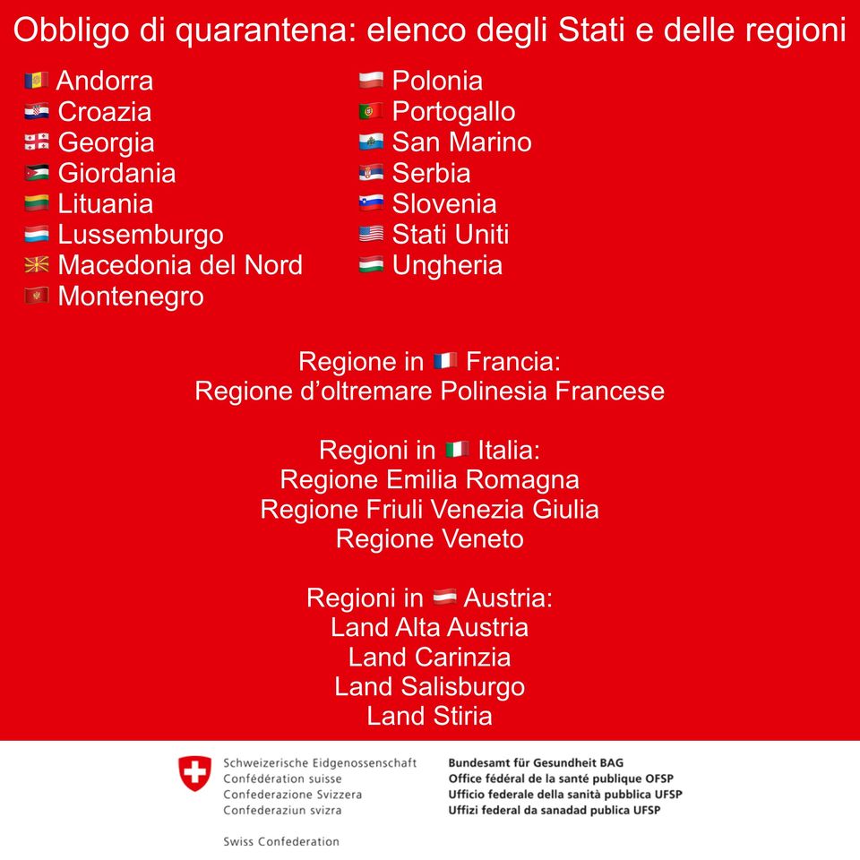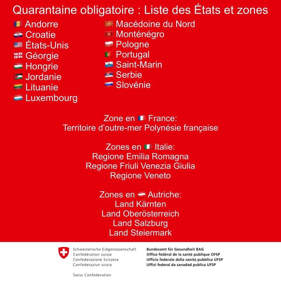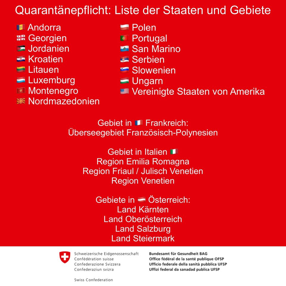Në Zvicër ekziston një kërkesë karantine për udhëtarët nga vende dhe zona të caktuara. Lista e këtyre shteteve dhe territoreve do të azhurnohet në 14 Dhjetor. Një rezultat negativ i testit nuk heq karantinën.