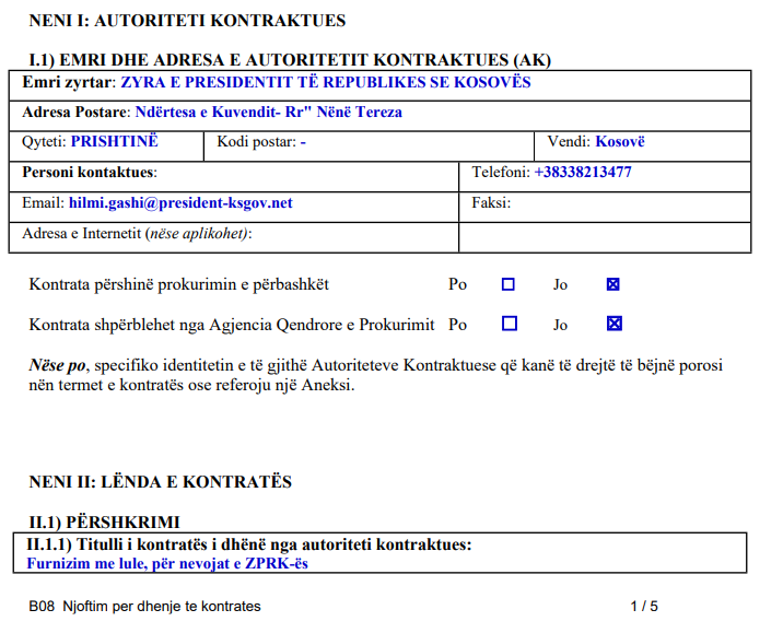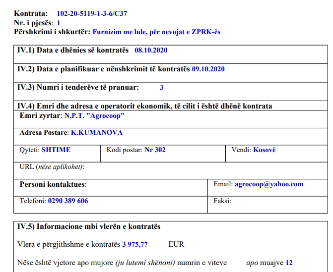 Përmes një postimi të publikuar në faqen zyrtare të Komisionit Rregullativ të Prokurimit Publik, ZPRK’ja ka bërë me dije fillimisht janë ndarë shtatë mijë euro për këtë tender, por që në fund është nënshkruar për rreth 4 mijë.