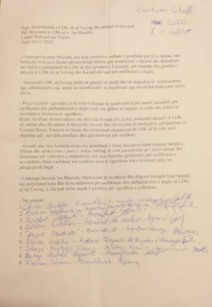 Mediat lokale në Ferizaj kanë publikuar edhe një letër që këta asamblistë kishin nisur në degën e kryesisë në Ferizaj me datë 9 dhjetor.